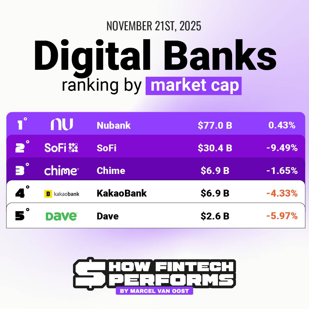 In contrast, SoFi declined –9.49%, Chime slipped –1.65%, KakaoBank dropped –4.33%, and Dave ended the week down –5.97%, reflecting widespread pressure across the segment.