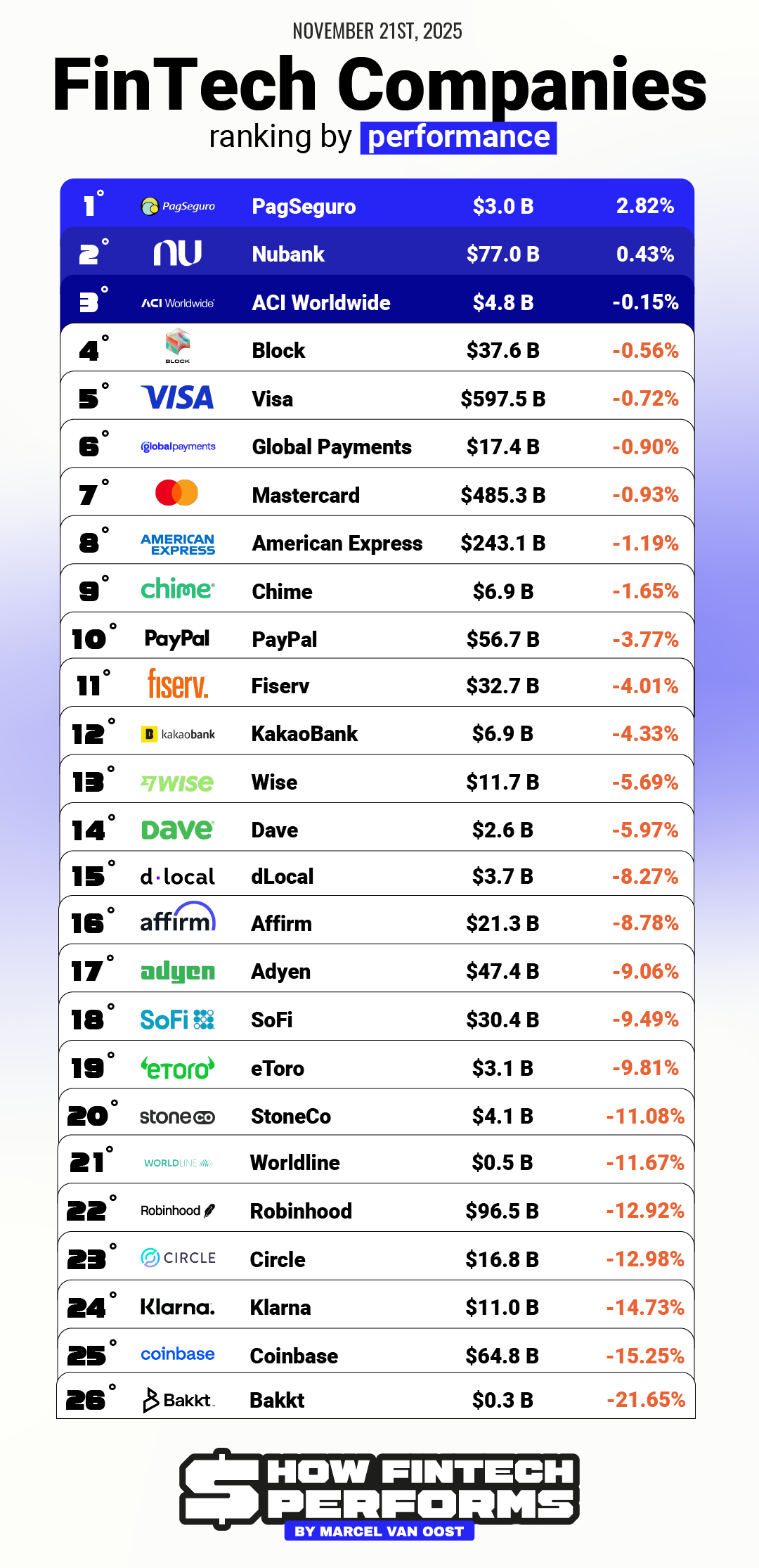 Digital banks faced another difficult stretch. Nubank remained the category’s clear leader and the lone bright spot with a modest gain of +0.43%, bringing its valuation to $77.0B.