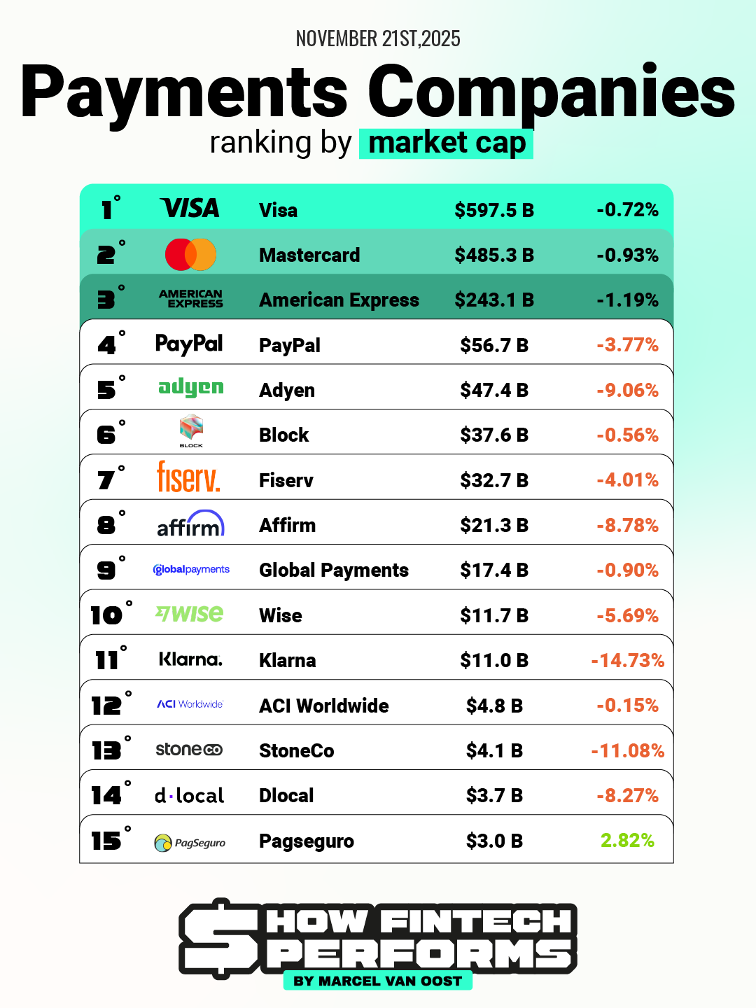 Visa held its dominant position at $597.5B (–0.72%), followed by Mastercard at $485.3B (–0.93%) and American Express at $243.1B (–1.19%).